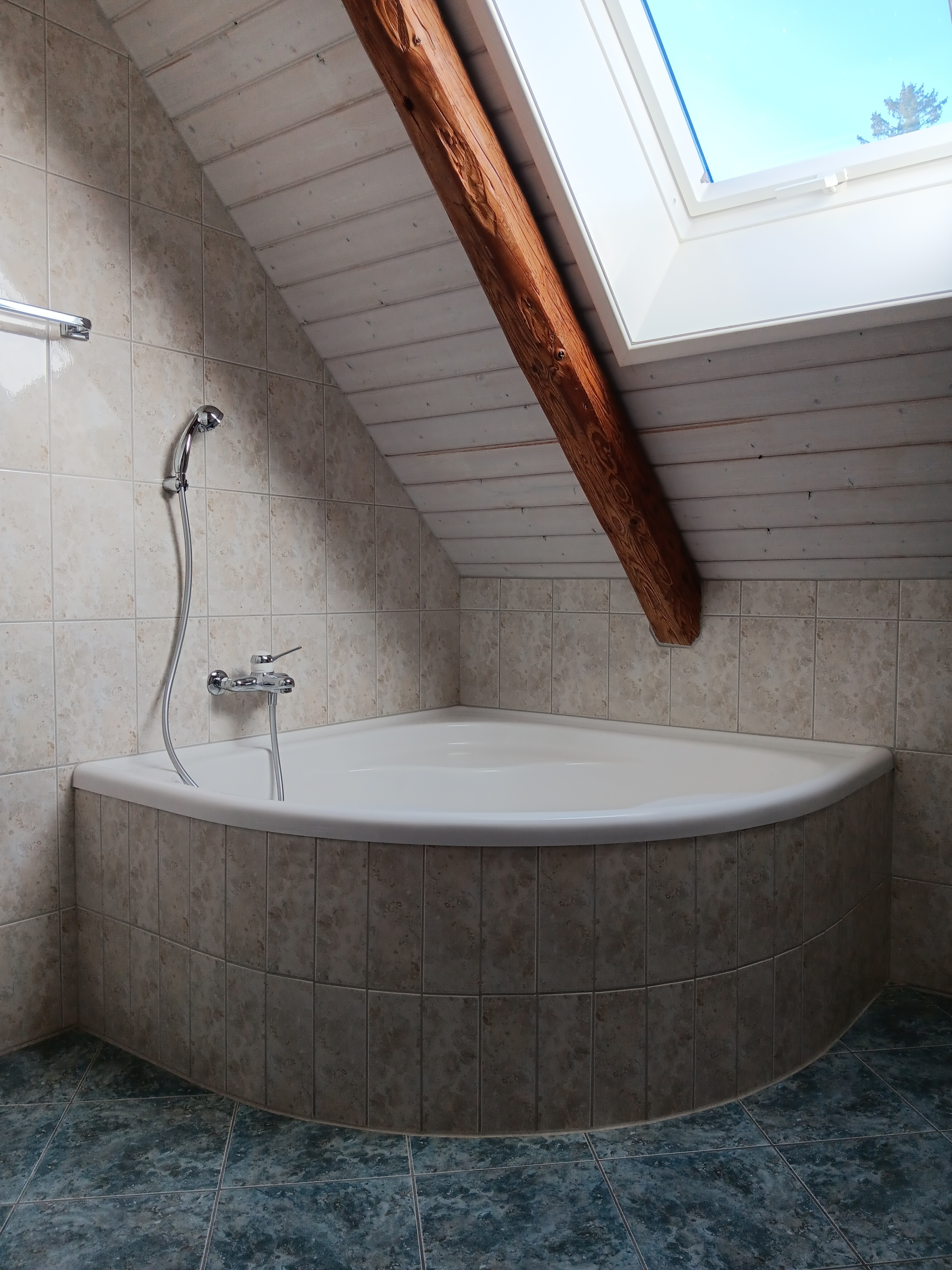 Salle de bains lumineuse — Baignoire d'angle, lavabo, WC